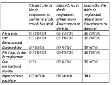 Le report de l’imposition a pour effet qu’aucun impôt sur les gains immobiliers (ou seulement une partie de cet impôt) ne soit prélevé au moment de la vente du bien immobilier. Il ne s’agit pas d’une exonération fiscale. En cas de revente ultérieure, tant la plus-value dégagée par l’immeuble de remplacement entre son achat et son aliénation que celle dégagée par l’immeuble remplacé seront imposées, à moins qu’il y ait à nouveau motif de report de l’impôt.